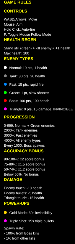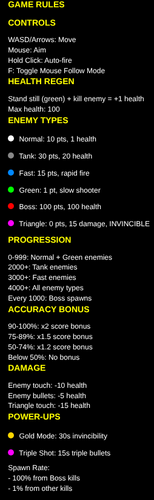 Play as a square and defend against the horde of circles and watch out for the triangles. Simple top down shooter i'm just messing around with.